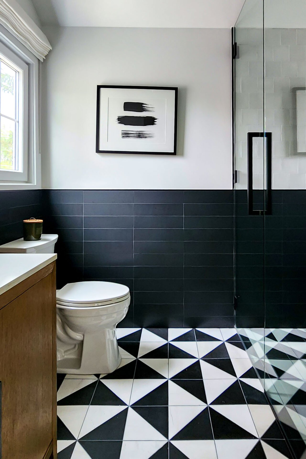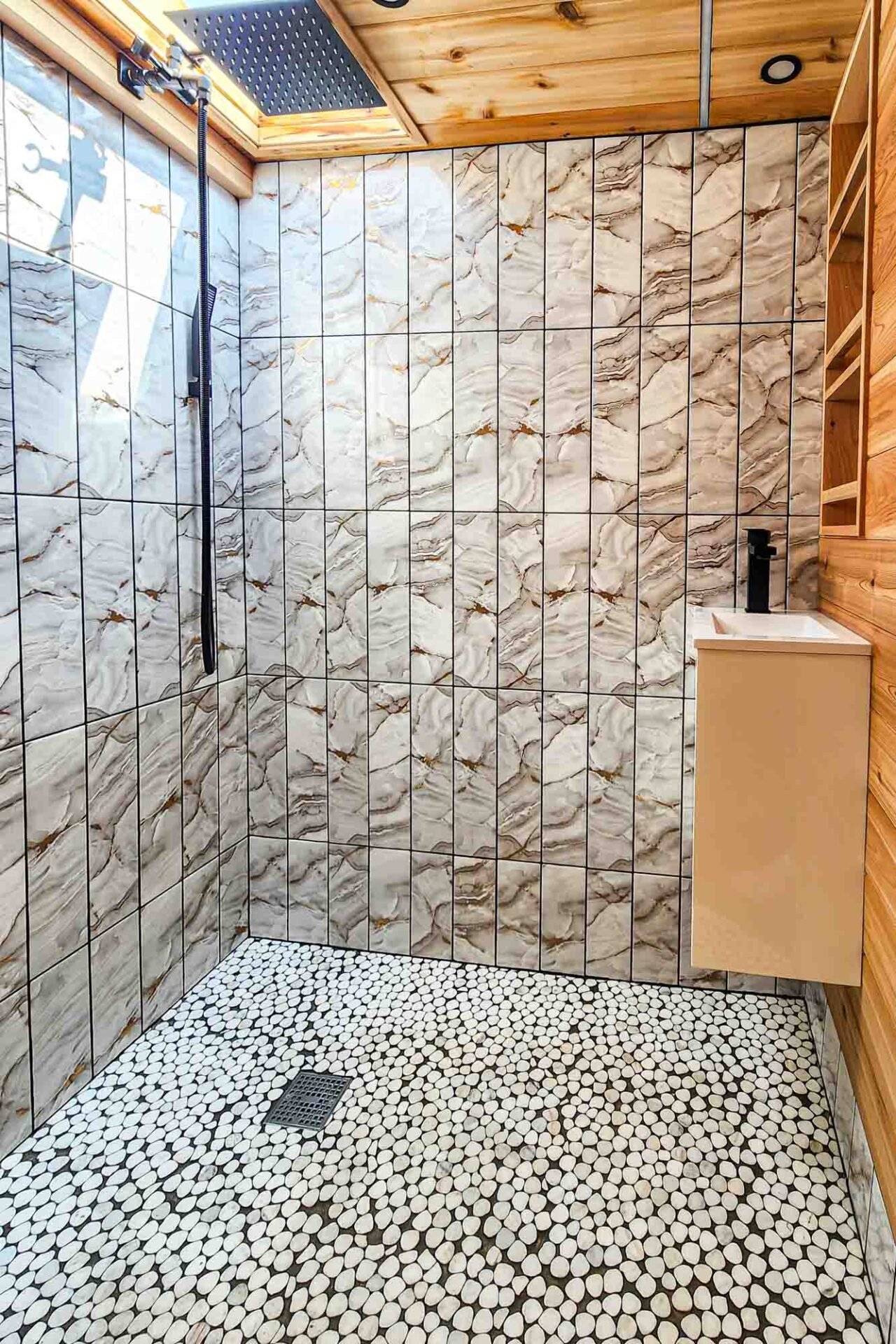 Porcelain tile is the most common choice. It handles moisture and wear well.
